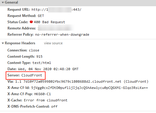如果发送一个request到AWS边缘节点的https端口,返回的headers信息中,server会显示为CloudFront,而大部分都会是nginx或其他web服务器,可以以此作为区分。