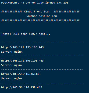 其中 cfscan.py 为 脚本名、 443-ip.txt为包含了IP的txt文件 200为线程数(卡顿调小)