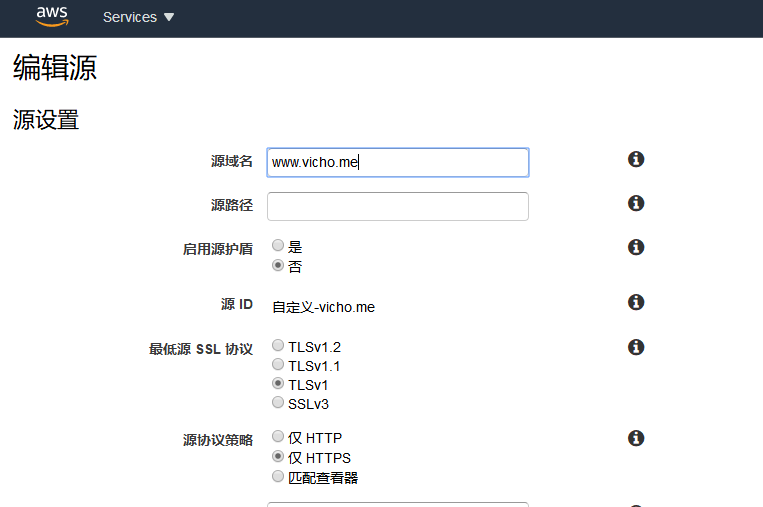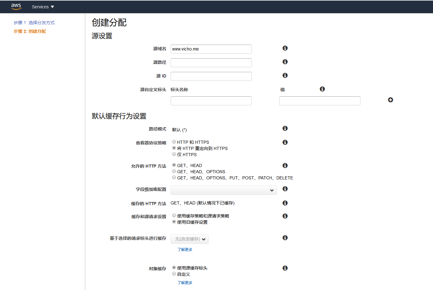 注意这里不要填写你要用的域名,这里其实是要填源站IP的,但是CloudFront不支持直接填写源站IP,所以你必须开个子域名直接指向源站IP,比如这里的 www.vicho.me 就是在DNS解析处指向了源站IP,如下