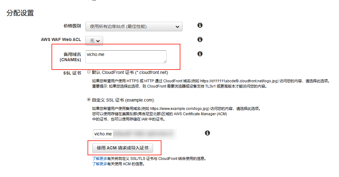 接下来重点就是,备用域名填你要使用的域名,然后通过ACM上传证书(DNS方式解析一条验证记录即可)