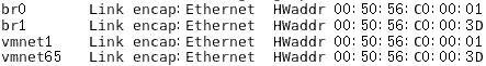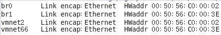 - 当虚拟交换机与虚拟网卡绑定之后,桥接网卡br0/br1的MAC地址会出现两种情况:第一种就是绑定之后MAC地址依旧显示的还是跟物理网卡一致。第二种情况就是绑定之后会被绑定的第一个vmnet网卡的MAC地址给覆盖掉,如果同局域网有多台宿主机都是这种情况,那么就需要将其他宿主机绑定的vmnet往后延,例如第一台宿主机从vmnet1开始绑定,那么第二台宿主机就从vmnet2开始绑定。