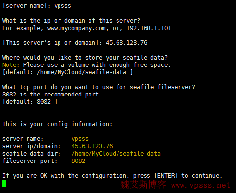 提示输入主机名、IP 地址(或者绑定的域名)、存储路径和端口都按照默认的,敲回车继续安装。